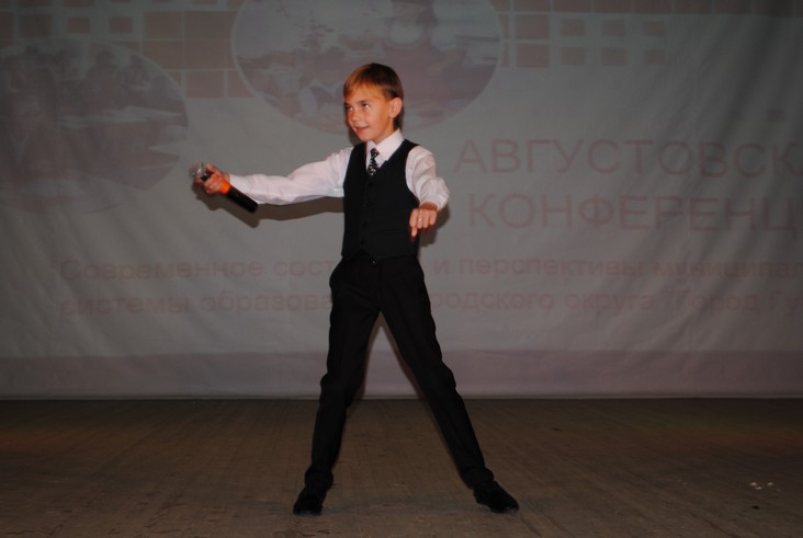 Музыкальным подарком для педагогов стало выступление Кирилла Есина, солиста вокальной студии "Вариант", участника международного детского вокального конкурса "Ты супер!"