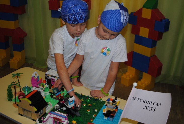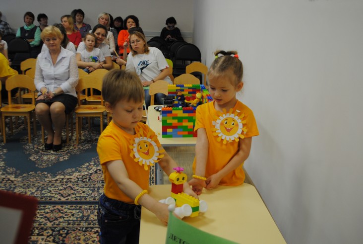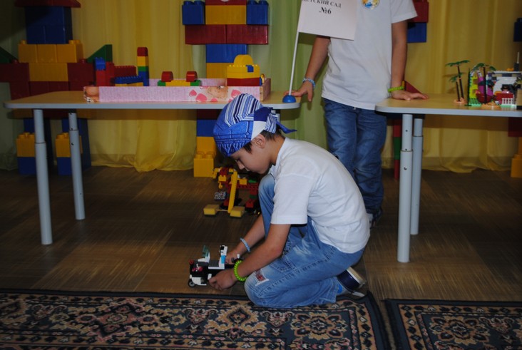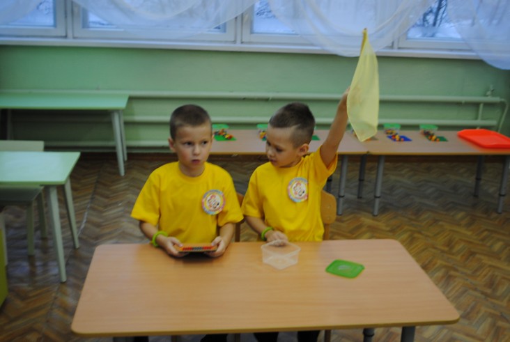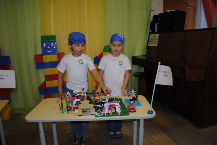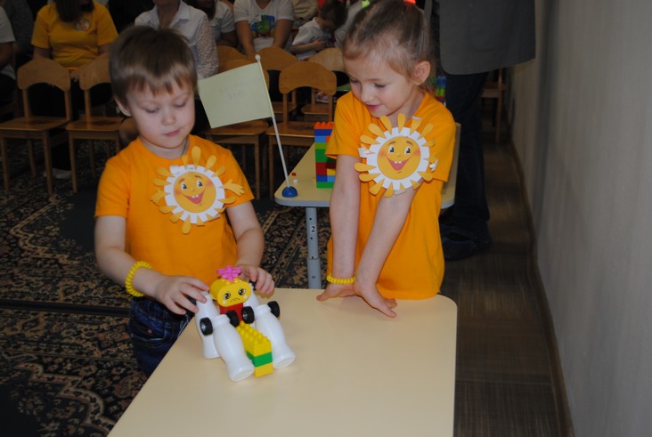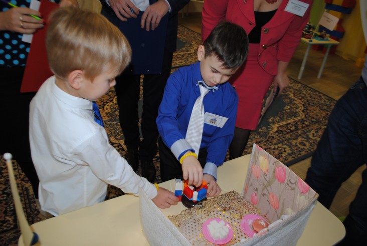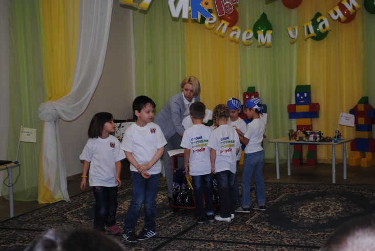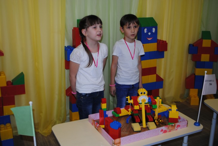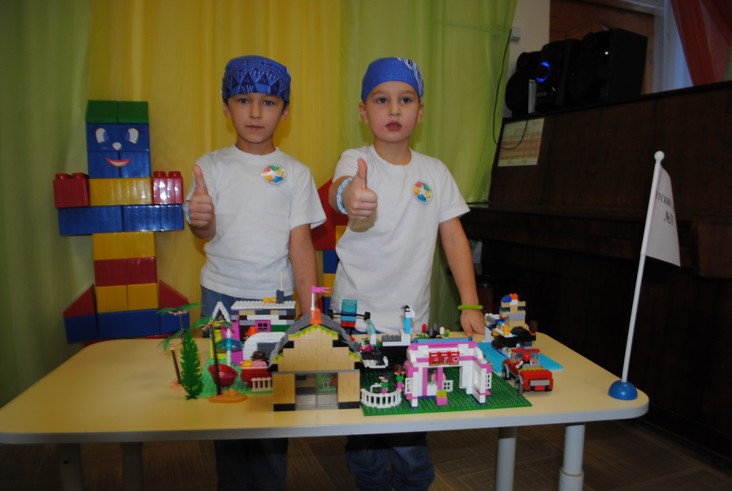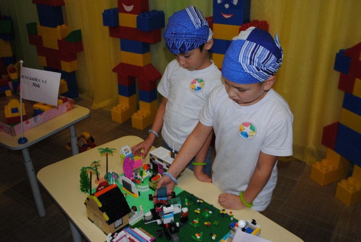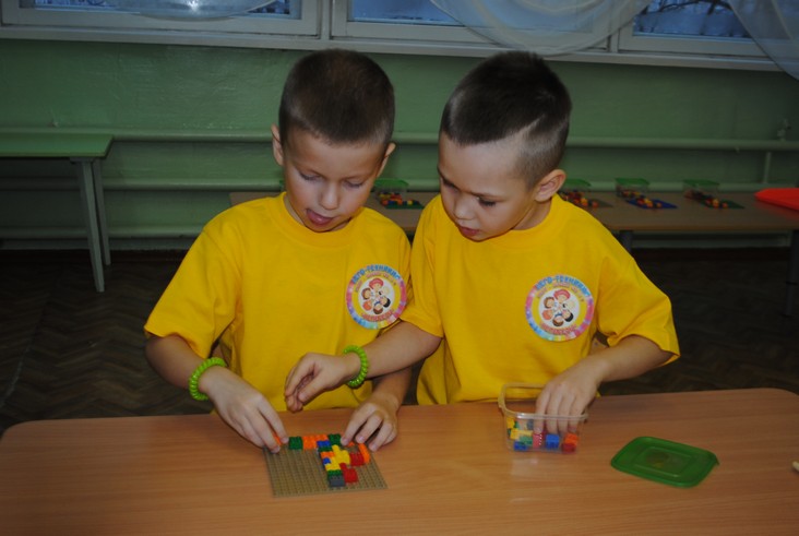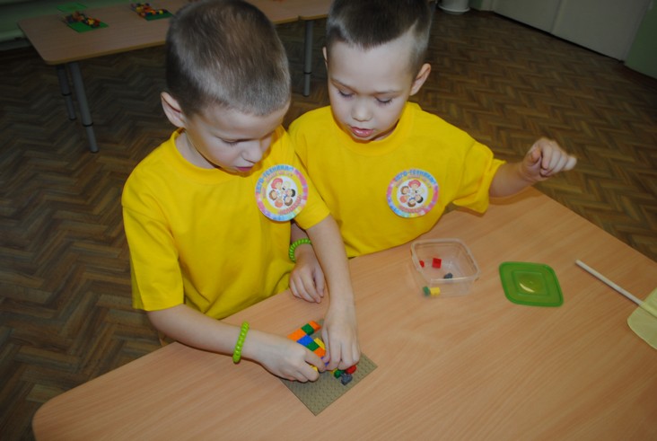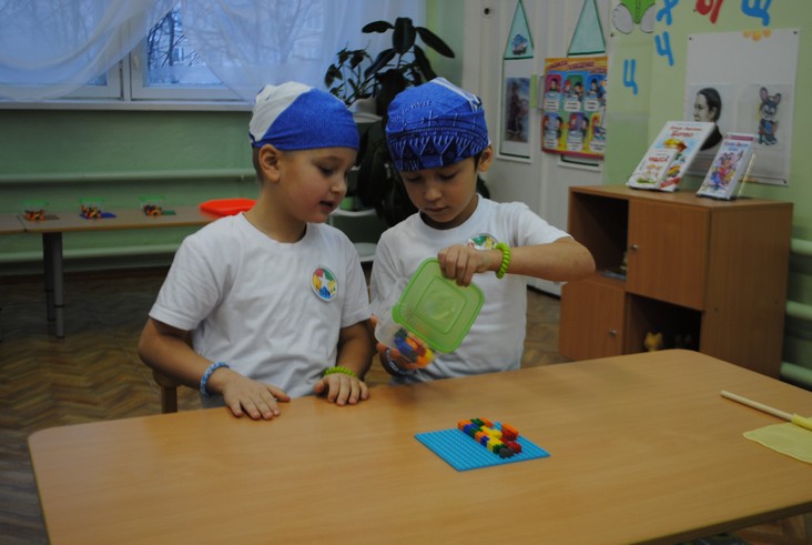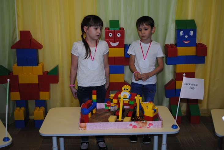 1 конкурсное испытание «Половинка моя (ЛЕГО-мозаика)». Здесь воспитанники соревновались в выполнении симметричной мозаики относительно вертикальной оси. Лучше всех справилась команда детского сада № 2.