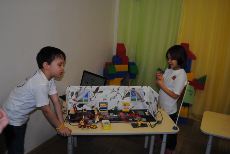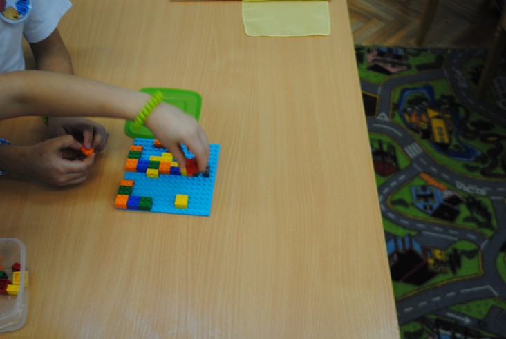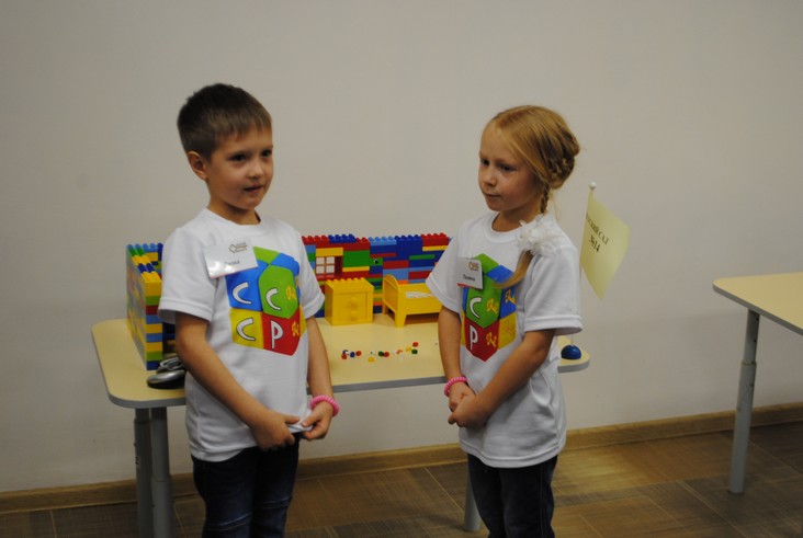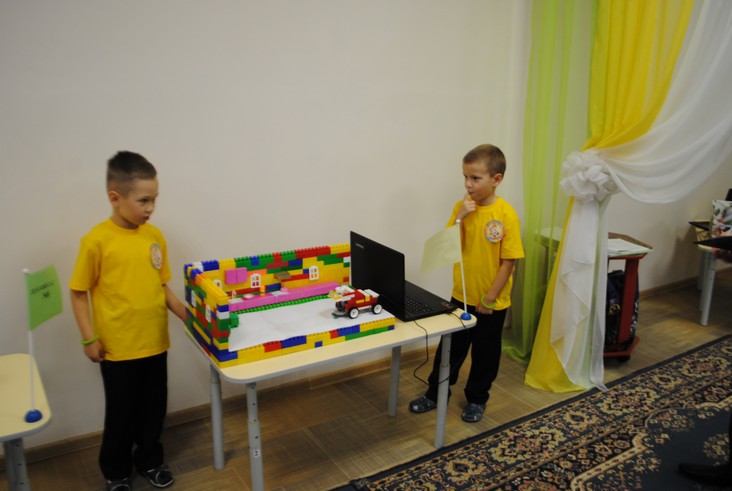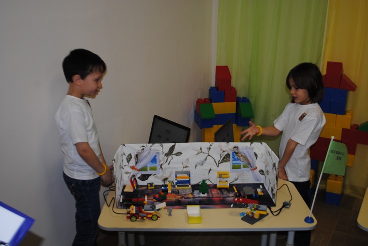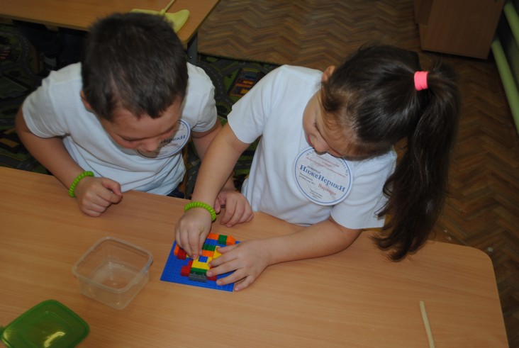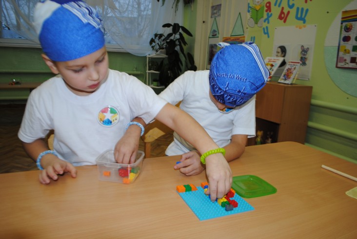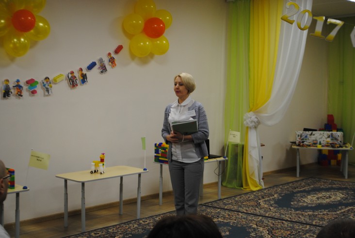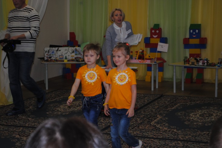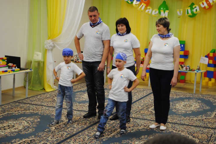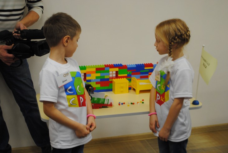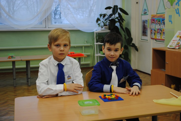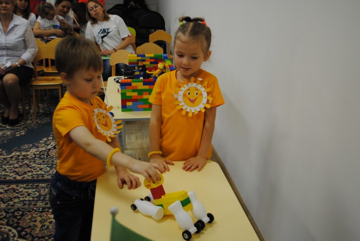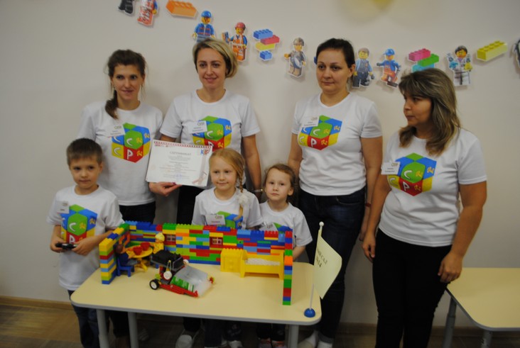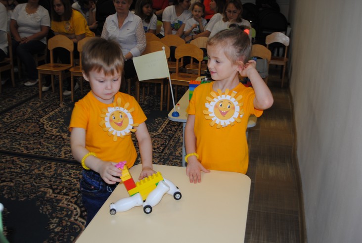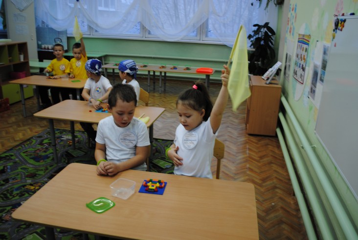 1 конкурсное испытание «Половинка моя (ЛЕГО-мозаика)». Здесь воспитанники соревновались в выполнении симметричной мозаики относительно вертикальной оси. Лучше всех справилась команда детского сада № 2.