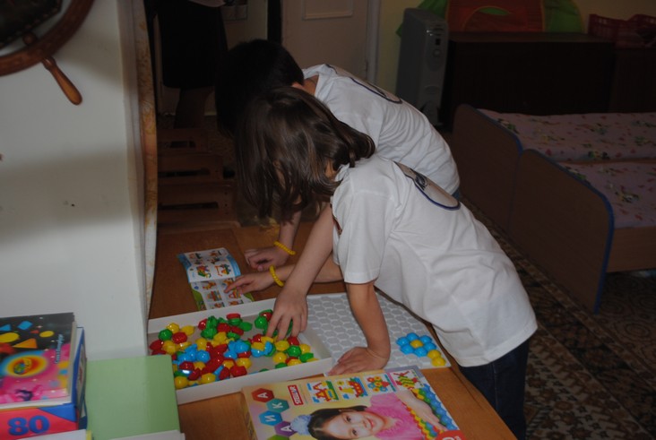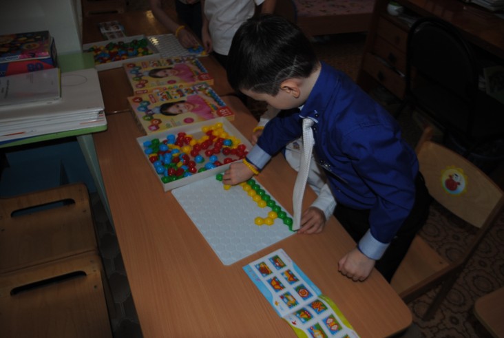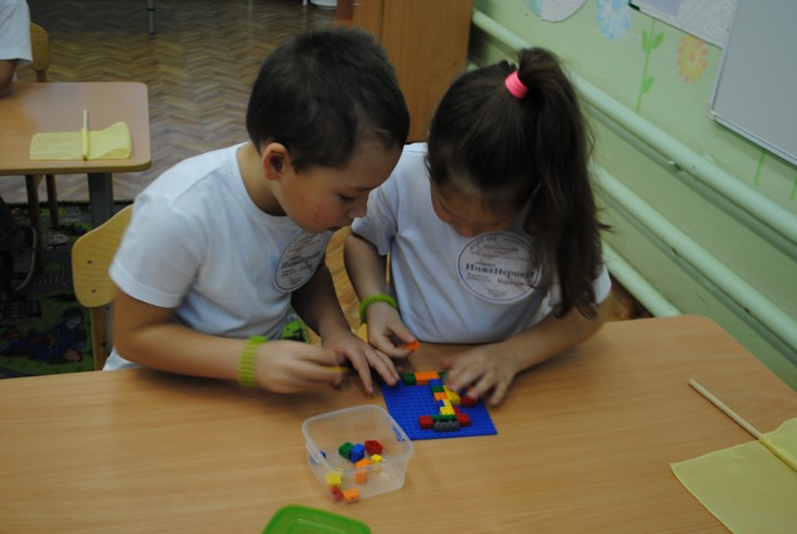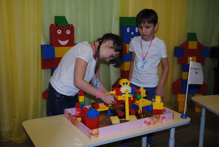 1 конкурсное испытание «Половинка моя (ЛЕГО-мозаика)». Здесь воспитанники соревновались в выполнении симметричной мозаики относительно вертикальной оси. Лучше всех справилась команда детского сада № 2.