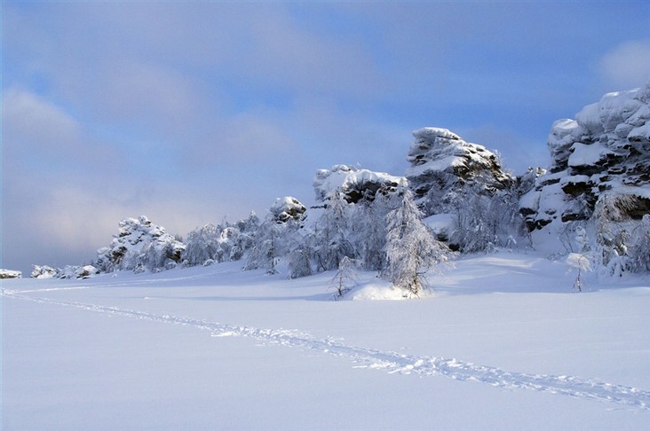 Склон горы Крестовая. По восточному склону горы вниз к Ладейному логу спускаются языки каменных рек-курумов. За миллионы лет некогда огромные скальные выступы песчаников под действием ветра и воды разрушились и превратились в нагромождения отдельных глыб и обломков.