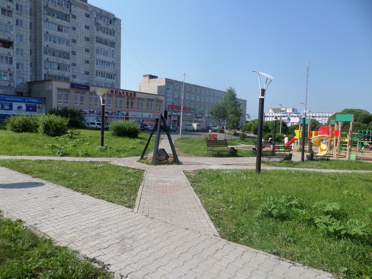 Красная площадь. Центральная площадь города вымощена красной плиткой. Губахинцы называют площадь «красной» еще и потому, что некогда на Верхней Губахе – бывшем административном центре – тоже существовала Красная площадь.