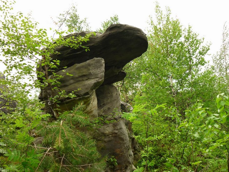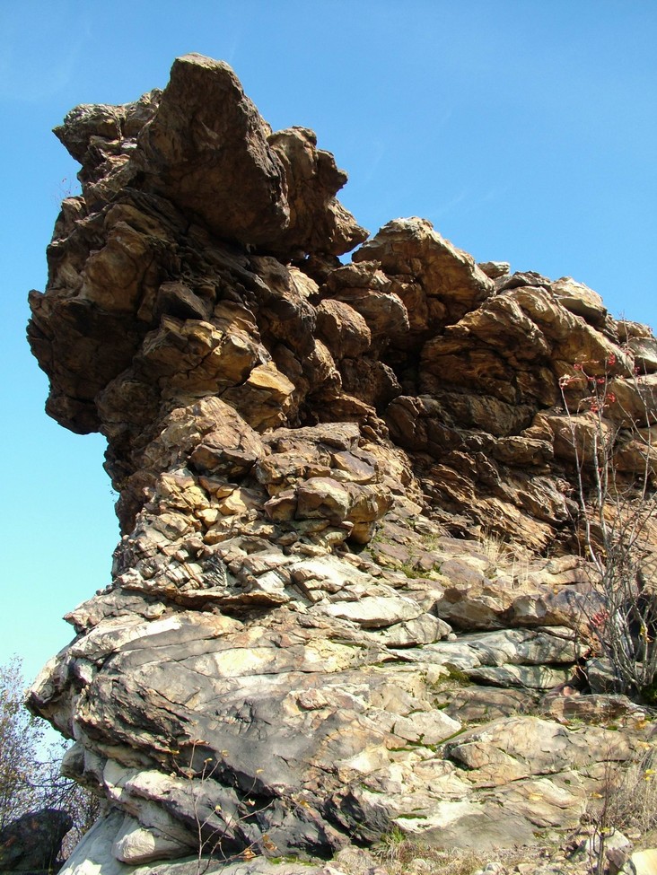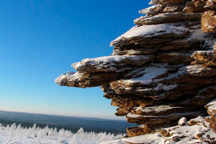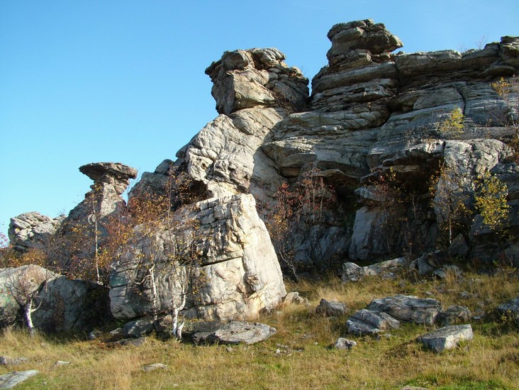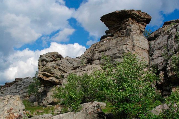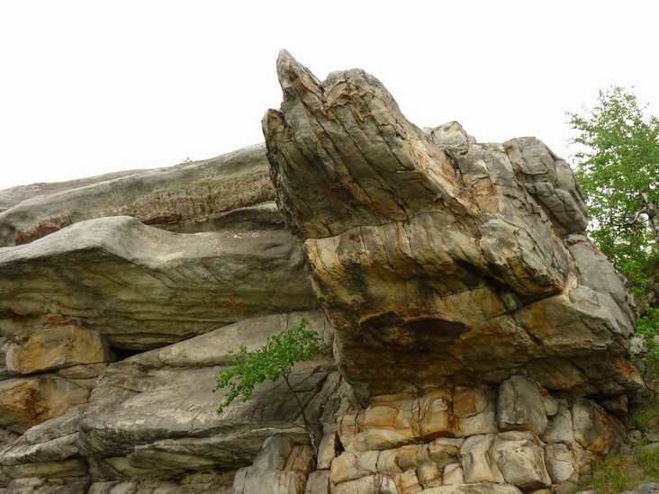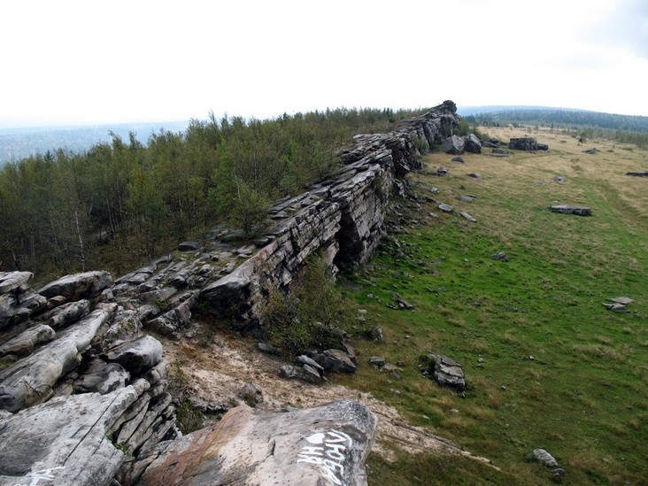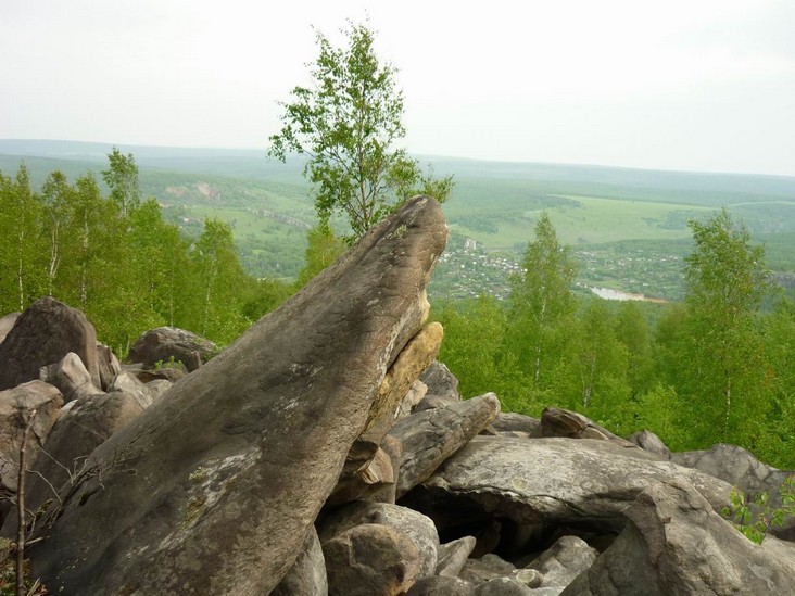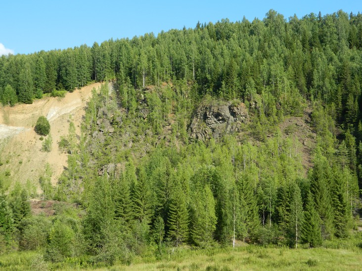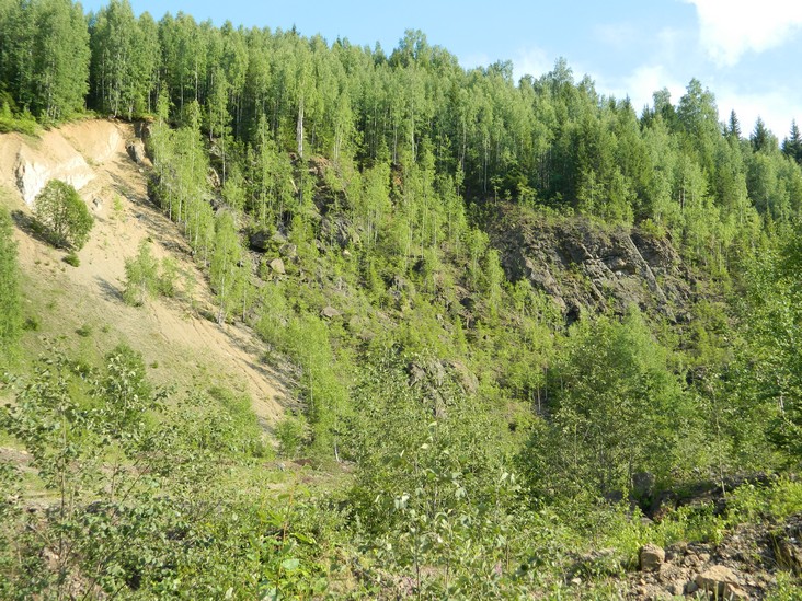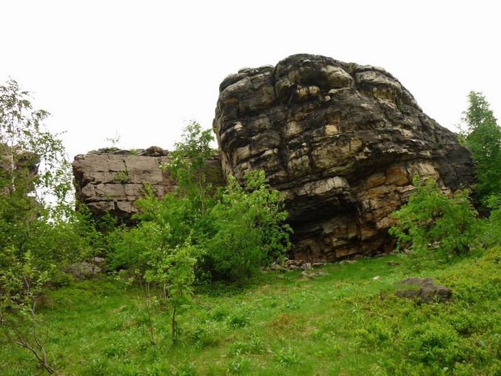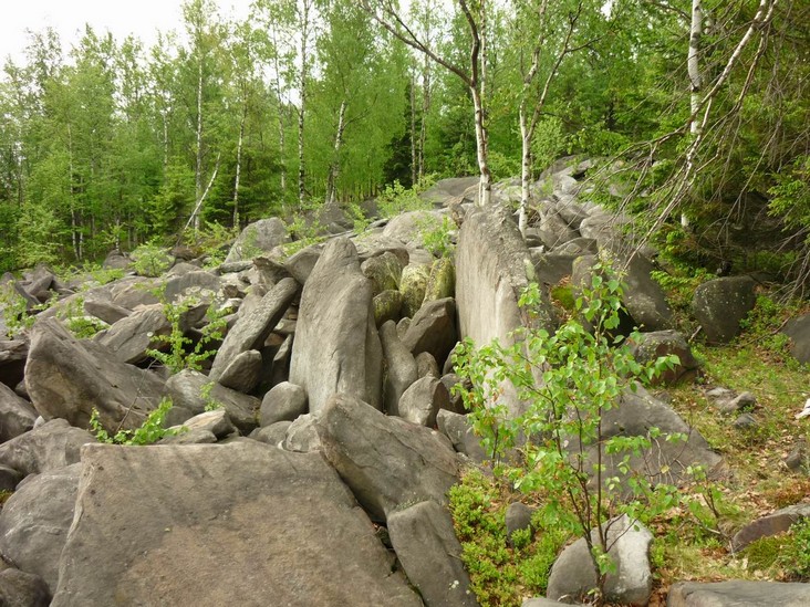Склон горы Крестовая. По восточному склону горы вниз к Ладейному логу спускаются языки каменных рек-курумов. За миллионы лет некогда огромные скальные выступы песчаников под действием ветра и воды разрушились и превратились в нагромождения отдельных глыб и обломков.