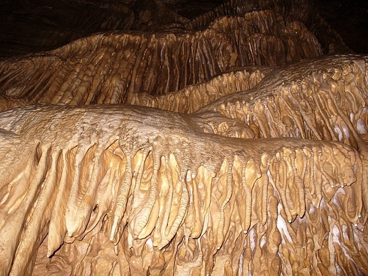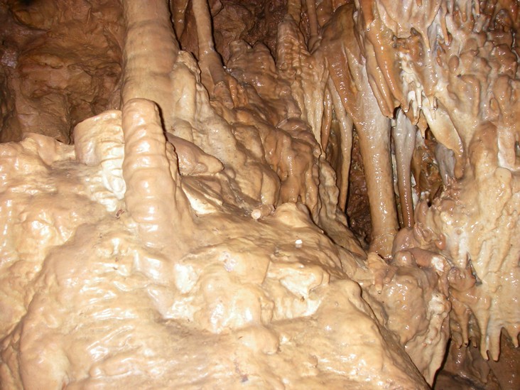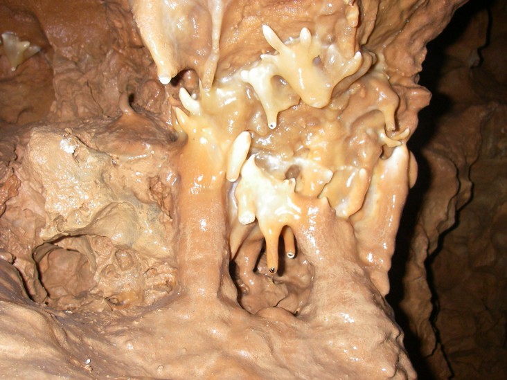 Свадебная галерея. Натечная кора образует сказочно - причудливые каскады, цветовая гамма разнообразна от светло-коричневой до голубого и белого цветов, иногда осложнена кальцитовыми наростами, под потолком собираются в колонии летучие мыши.