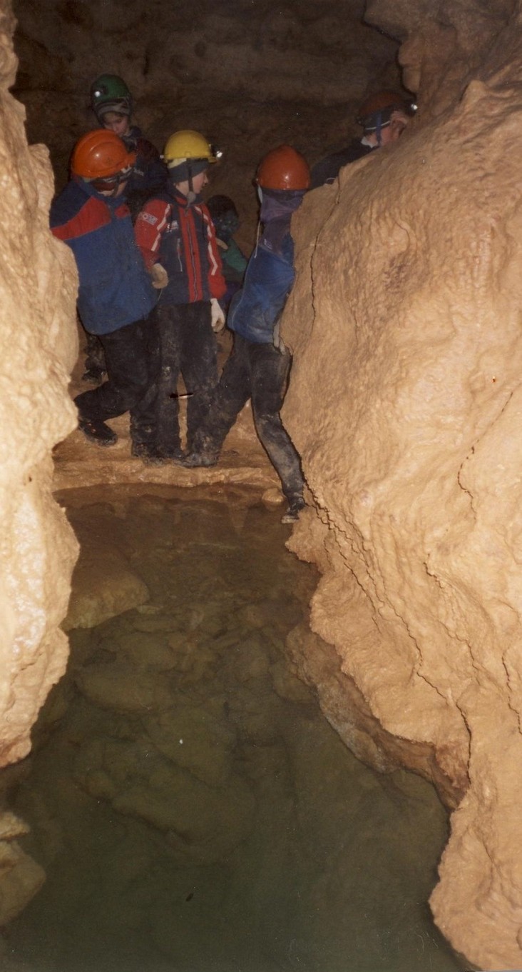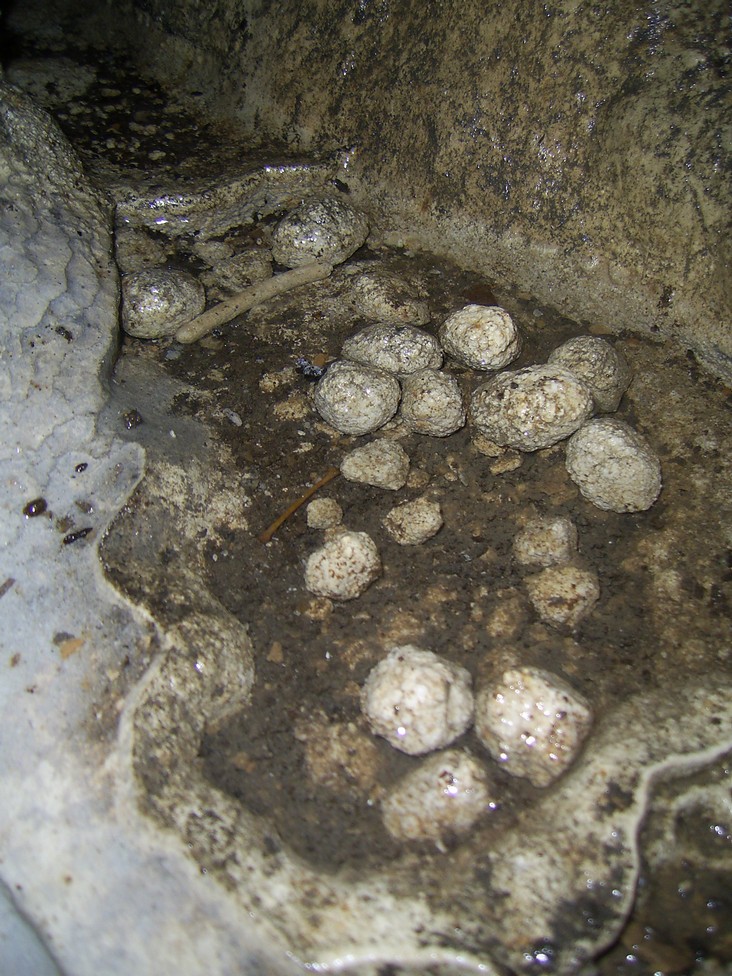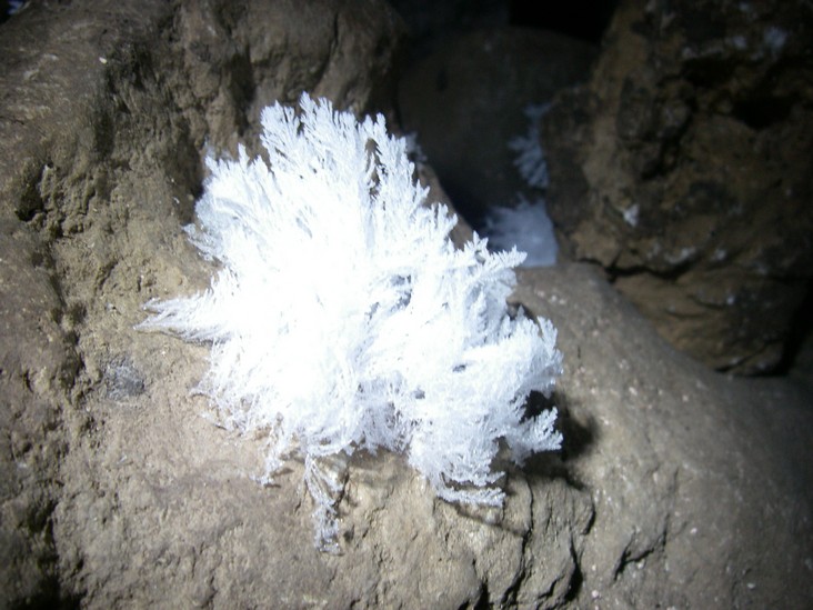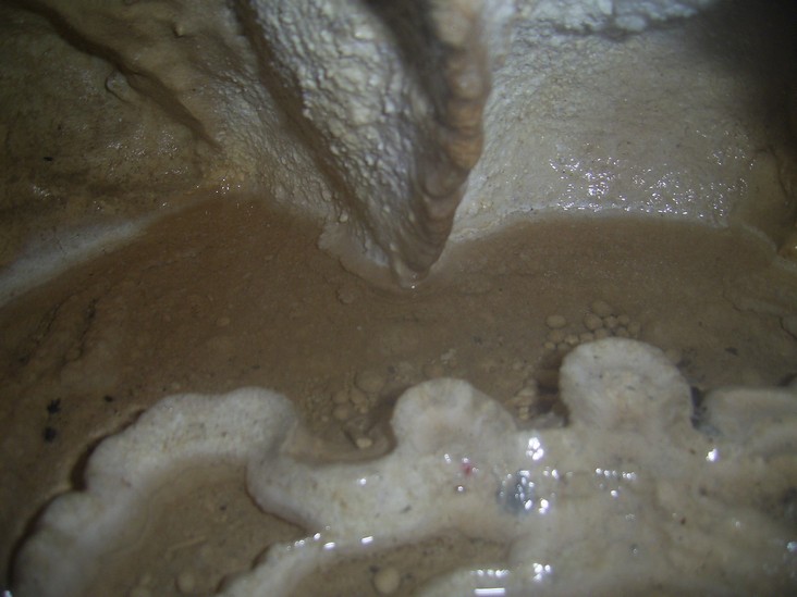 Меандр. Ход пещеры до озера, представляет собой меандр, стенки которого обросли кальцитовой корой, кораллитами, пещерным молоком, с потолка свисает множество сталактитов разной окраски. В узких боковых ответвлениях образовались не большие кальцитовые озерка с пещерным жемчугом.