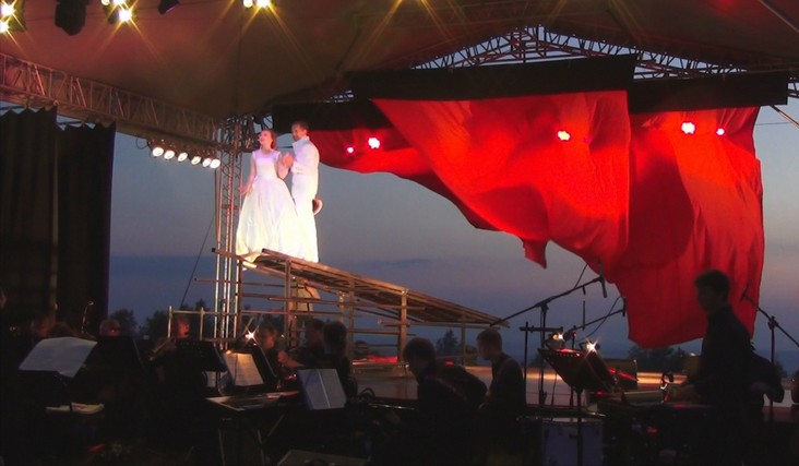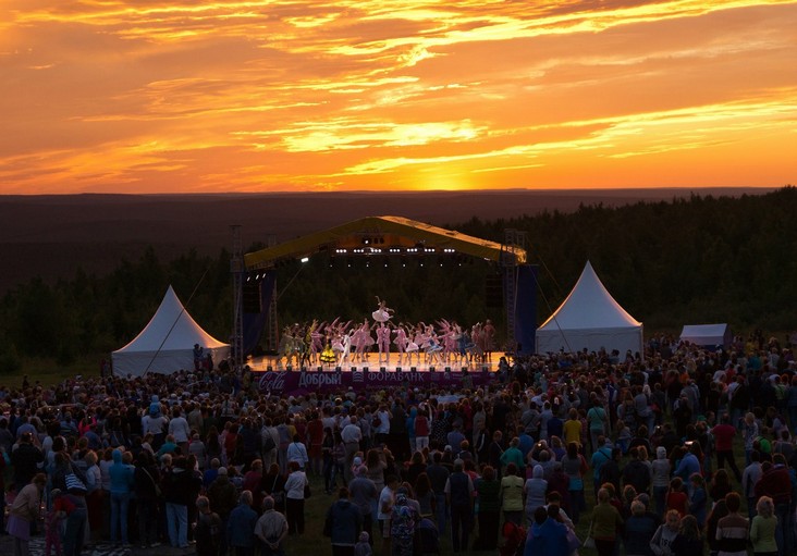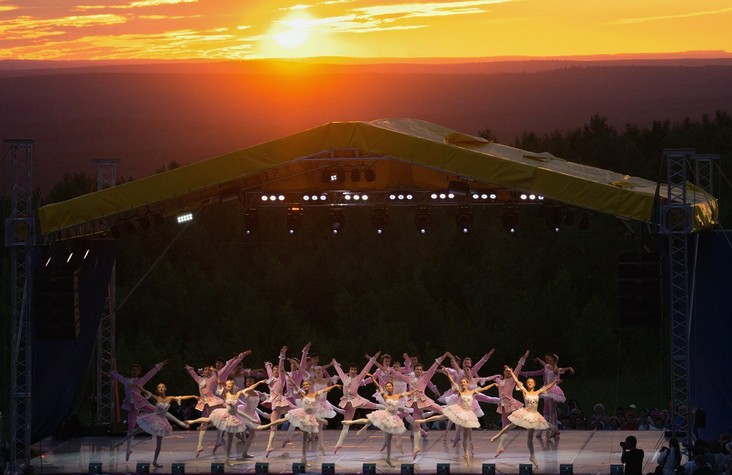 Ведущие театры Перми в конце июня представляют перед зрителями свои лучшие спектакли, декорациями к которым служит пейзаж горного хребта Рудянский спой в лучах закатного солнца.