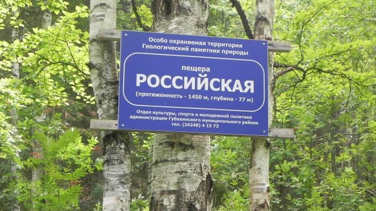 Пещера Российская – пещера первого Всероссийского слета спелеологов, была открыта в 1983г. Пещера заложена в визейских известняках нижнекаменноугольного периода. Протяженность - 1280м, глубина – 72м., средняя высота – 4.5 м., площадь – 3200 м2. В пещере развиты ходы и гроты меридионального направления, широтное направление имеют некоторые ходы и боковые ответвления, на пересечении которых образовались вертикальные колодцы и уступы , высотой 4 -9 м. Географические координаты по системе (W G F – 84 ( 58°40,476 сев. широты, 57°36,796 зап. долготы).